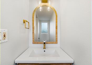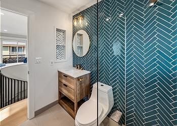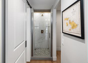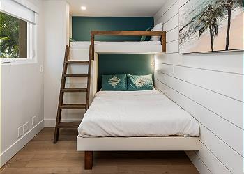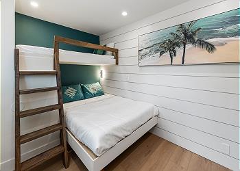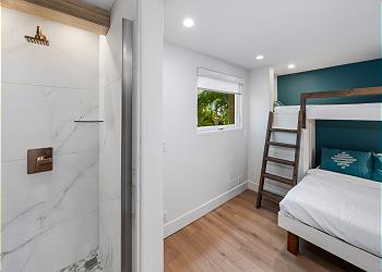 Downstairs, you’ll find a private washer and dryer for added convenience, as well as a guest bedroom featuring a bunk bed with a twin on top and a full-size bed on the bottom. A full bathroom with a walk-in shower is conveniently attached.