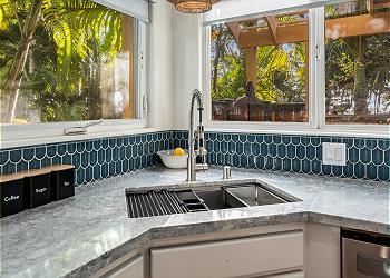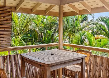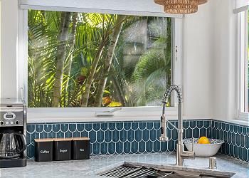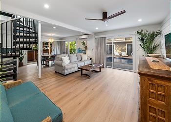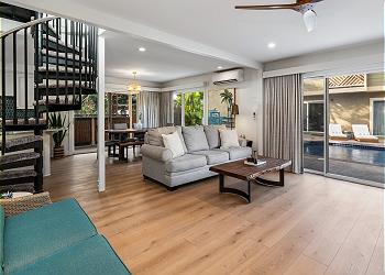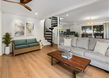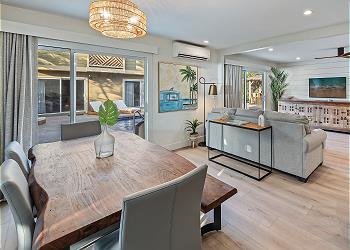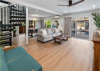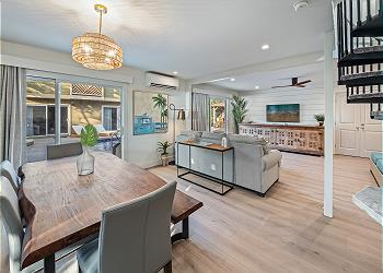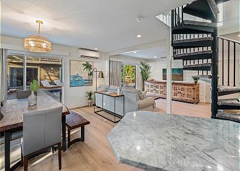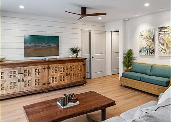 The fully equipped kitchen offers upgraded appliances and everything you need to prepare meals and host dinners after a day of island adventures. The living room includes two comfortable couches, one of which converts to a sofa bed for additional guests, along with a large flat-screen TV and split A/C to keep you cool and comfortable.