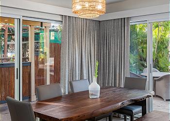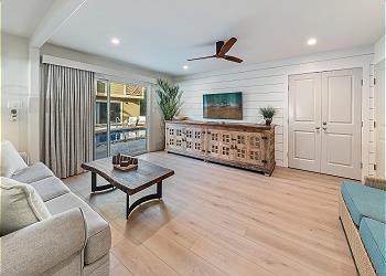 This unit features a spacious, open-concept living and dining area filled with natural light from large sliding glass doors that open directly to the shared pool area. A large private side patio provides the perfect space for outdoor dining or relaxing after a day at the beach.
