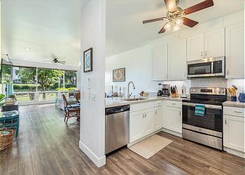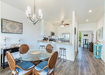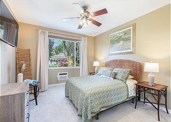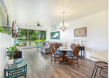 Inside, the bright, open-concept condo blends comfort and island style with large picture windows, inviting living spaces, and a private covered lanai—perfect for morning coffee or sunset cocktails. The fully equipped chef’s kitchen is large and spacious with everything you need, making meals easy and enjoyable. A/C is available in the living room and front bedroom, with ceiling fans in the back bedroom, plus Wi-Fi for your convenience.