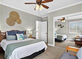 Upstairs, both bedrooms are designed with comfort in mind and feature inviting furnishings, ample natural light, televisions, and generous storage space. The primary bedroom includes an ensuite bathroom and a private lanai with comfortable lounge seating—an ideal place to enjoy the peaceful surroundings.