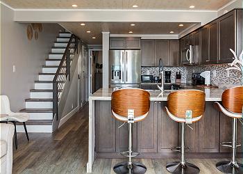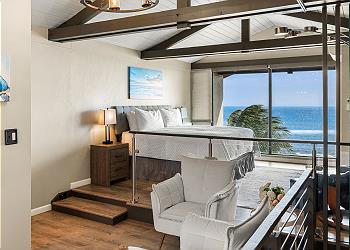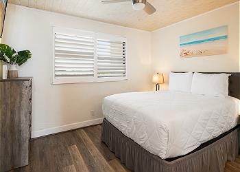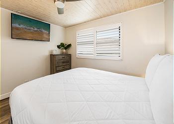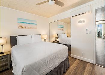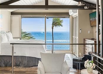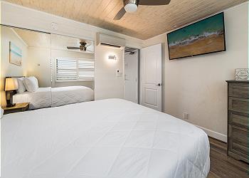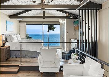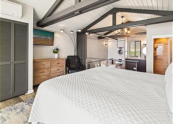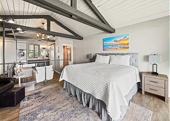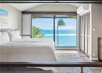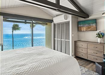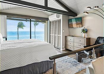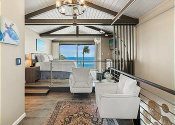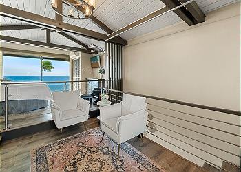 The upstairs bedroom offers a king bed, flat screen TV, sitting area with stunning ocean views and an updated bathroom with walk in shower.