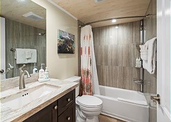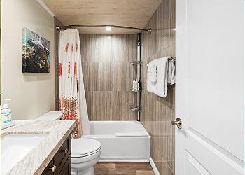 The downstairs bedroom has a queen bed and flat screen TV. Downstairs bathroom is also updated with a tub and shower combo.