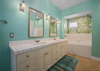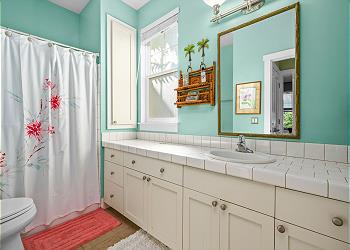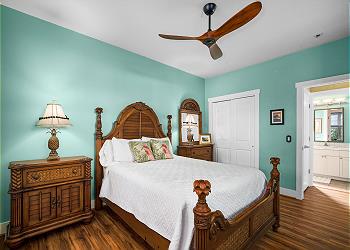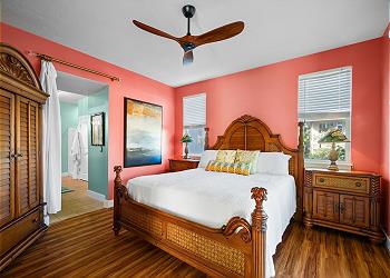Inside, the home is cute, stylish, and thoughtfully designed with high ceilings and light, airy tones that create a relaxing island vibe. The primary bedroom features a comfortable King bed and a spacious en-suite bathroom with an oversized oval tub. The guest bedroom offers a cozy Queen bed, perfect for family or friends.