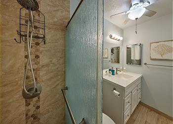 Our second-floor, one-bedroom, one-bath condo has been updated with luxury vinyl plank flooring throughout (no carpet). The unit includes a well-equipped kitchen, three quiet ceiling fans, and air conditioning in the living area. The bedroom features a king bed, and the living room includes a queen sofa sleeper. High-speed Wi-Fi, cable TV (48" and 32"), and beach gear (chairs, umbrella, towels) are included.