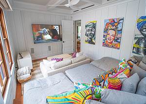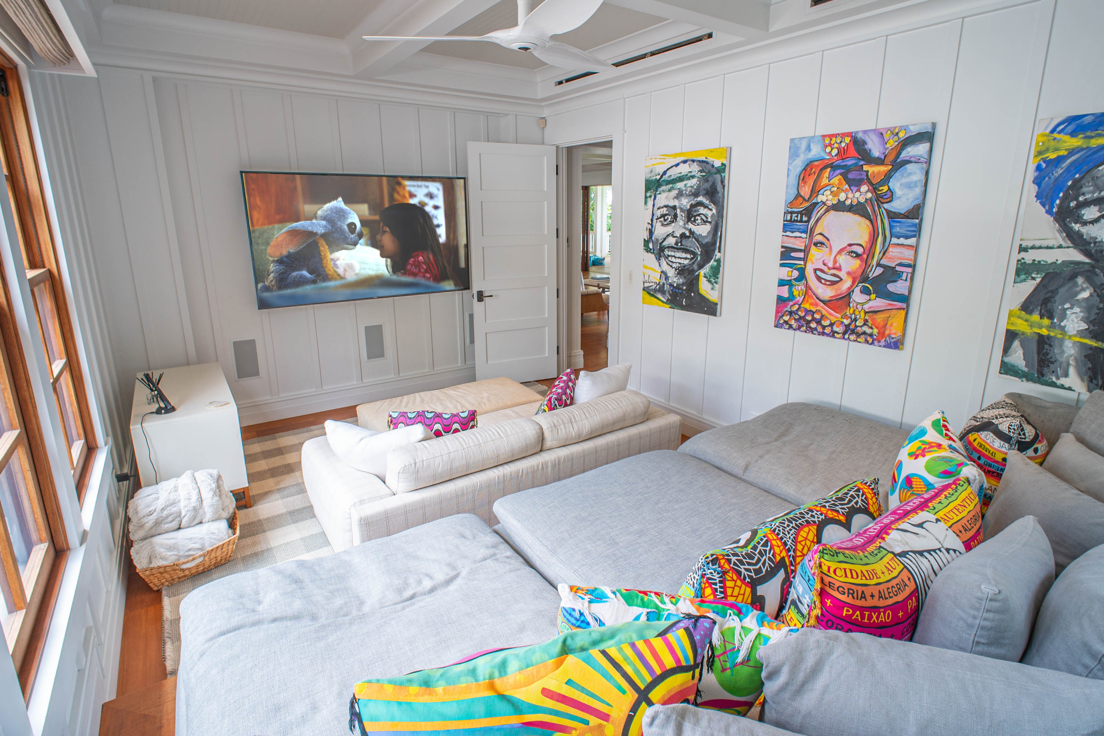 Media room with plush seating and Xtra-Large TV screen.