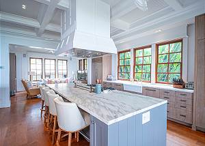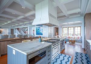 Gourmet chef’s kitchen featuring European appliances, gas range, and dual islands and a walk-in temperature-controlled wine cellar