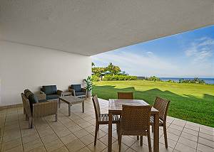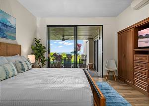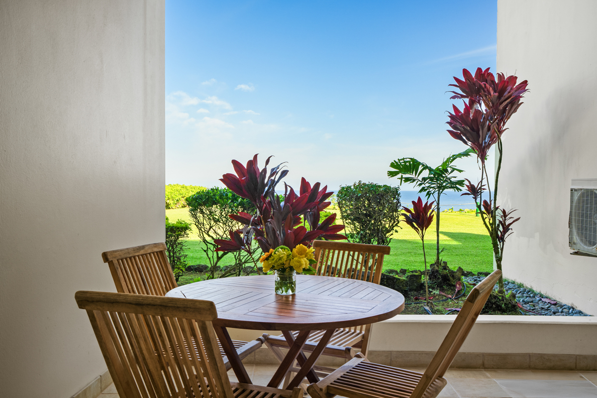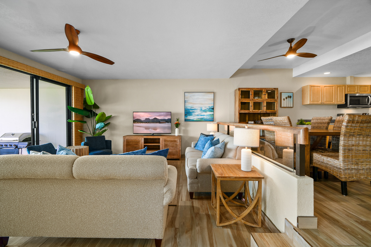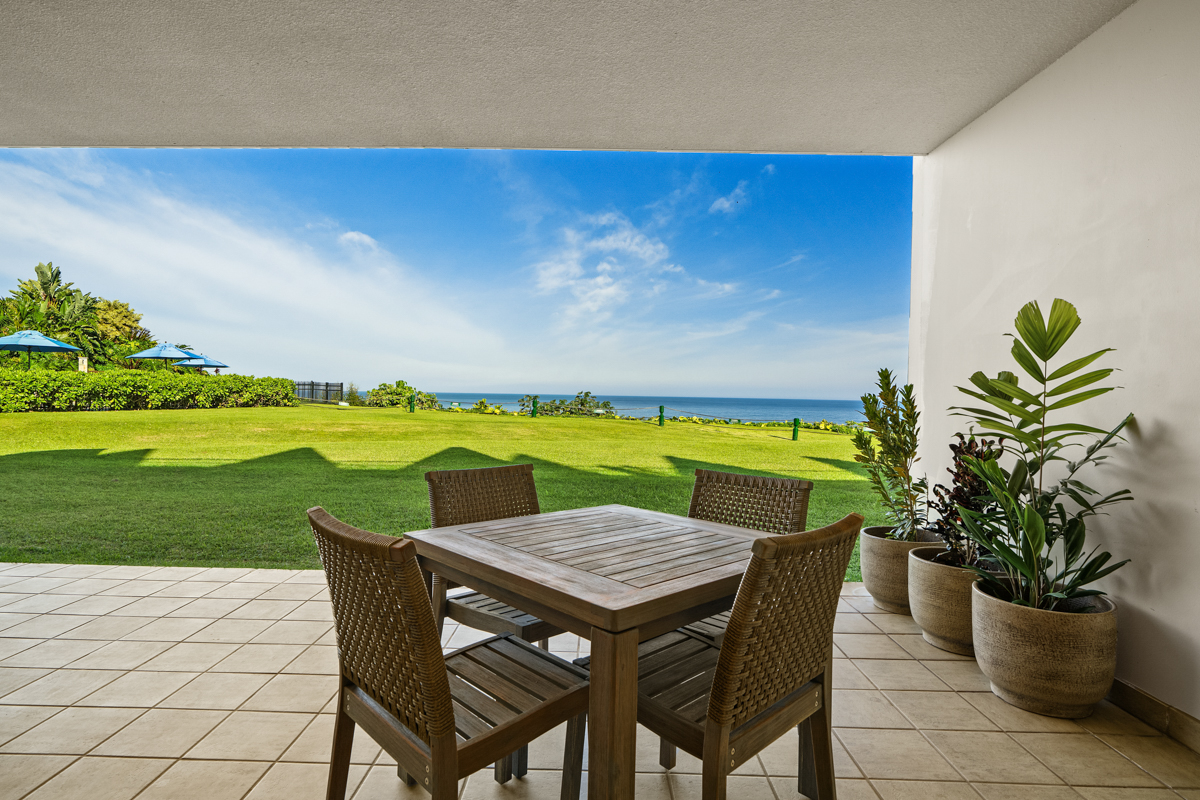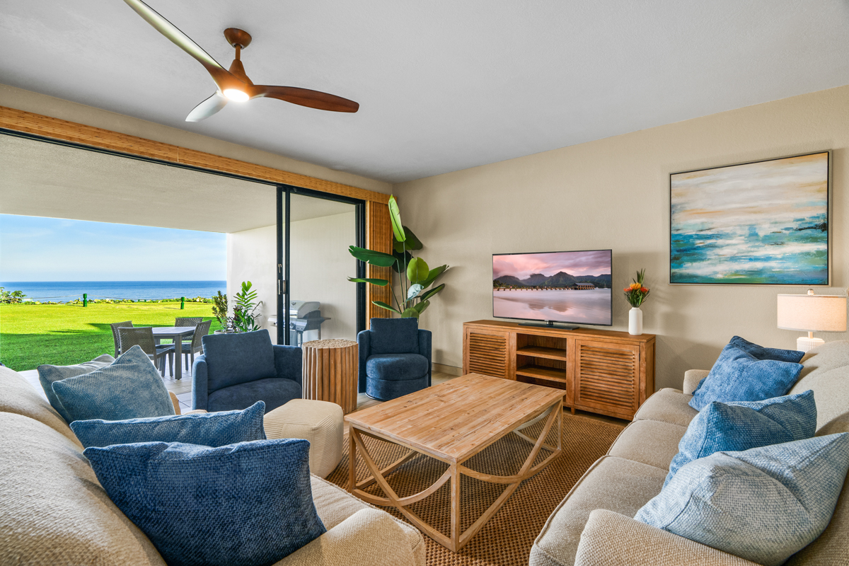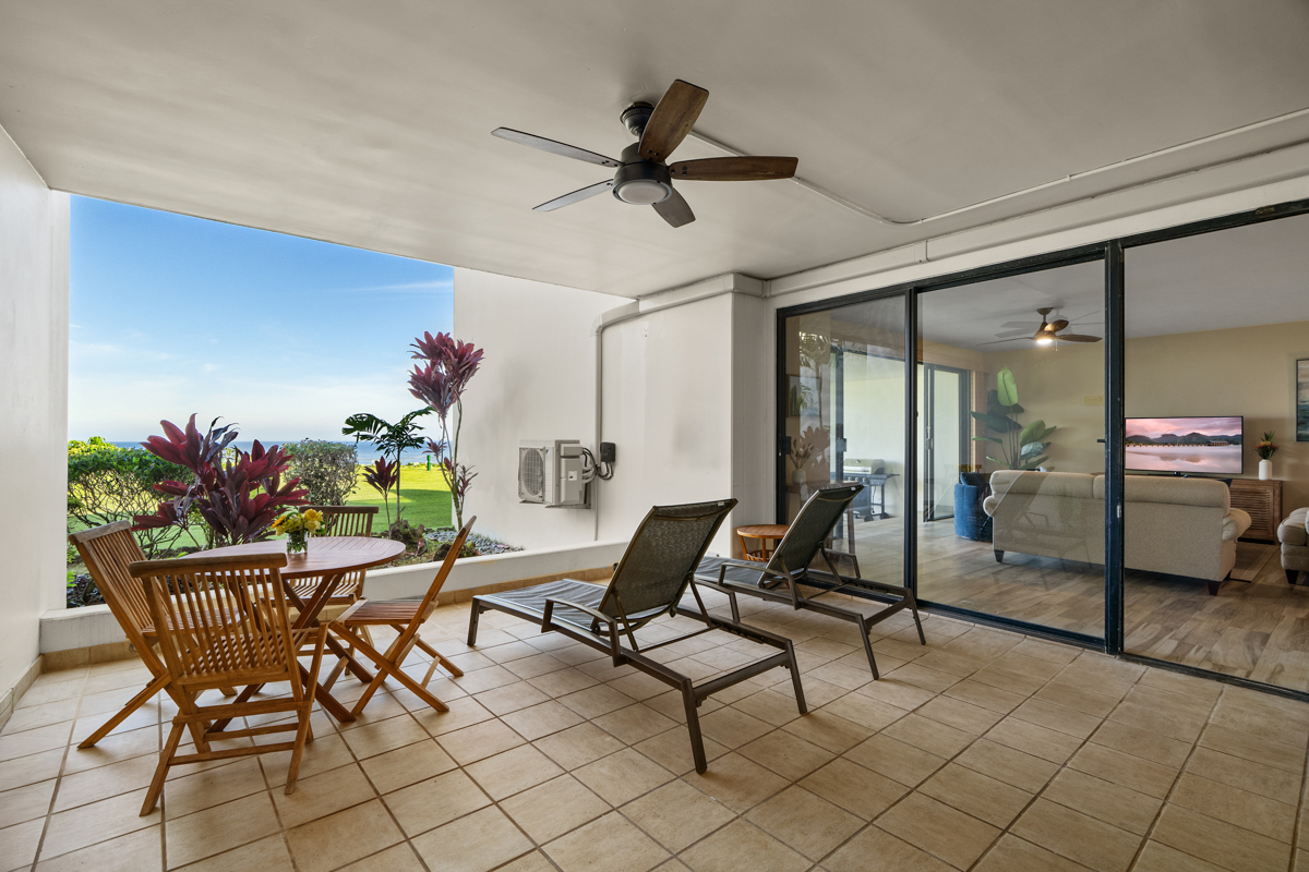 This beautiful first-floor, two-bedroom unit features ocean views and access to a huge manicured lawn atop Hideaways beach. The main living area features modern furniture with an HD smart TV for all your entertainment needs. There is high-speed internet and two separate massive lanais. One boasts outdoor dining and seating and the other has a large BBQ and chaise loungers to relax in.