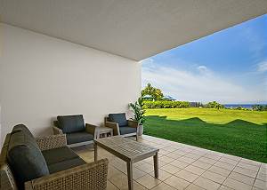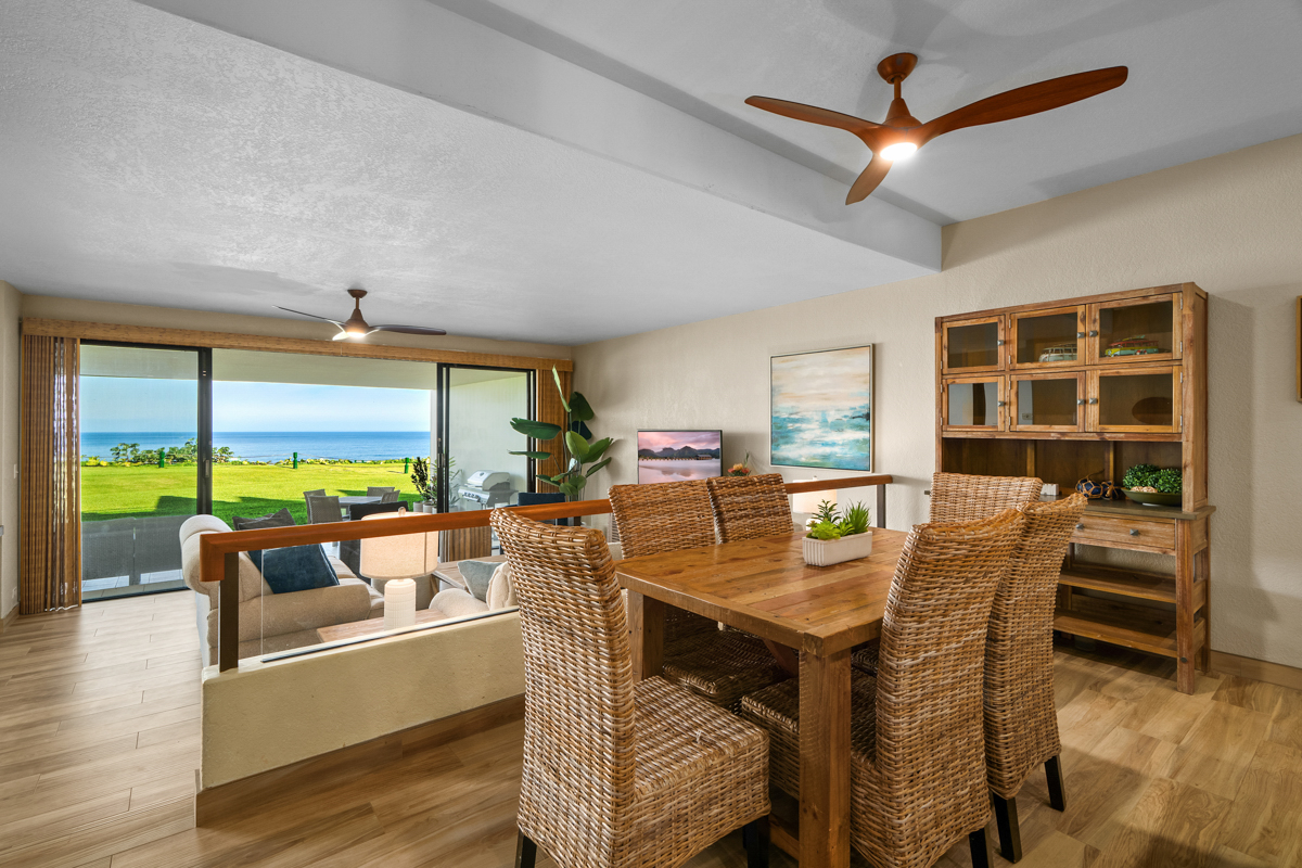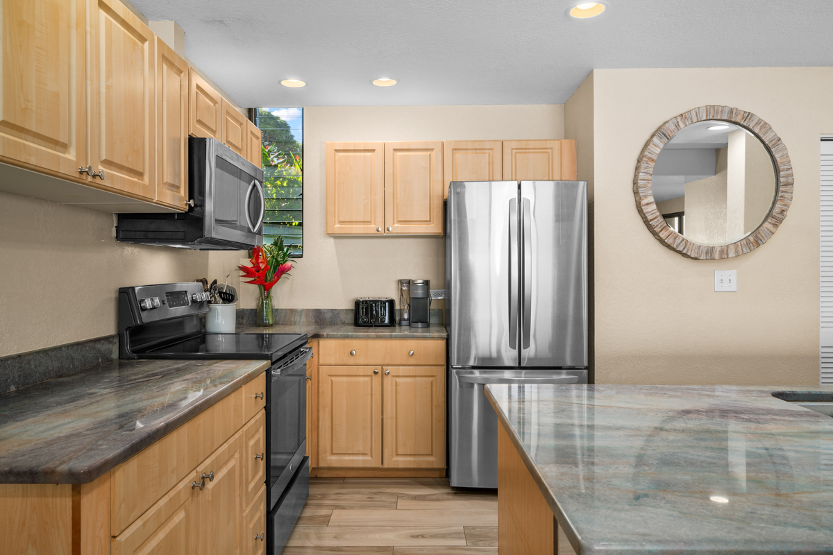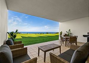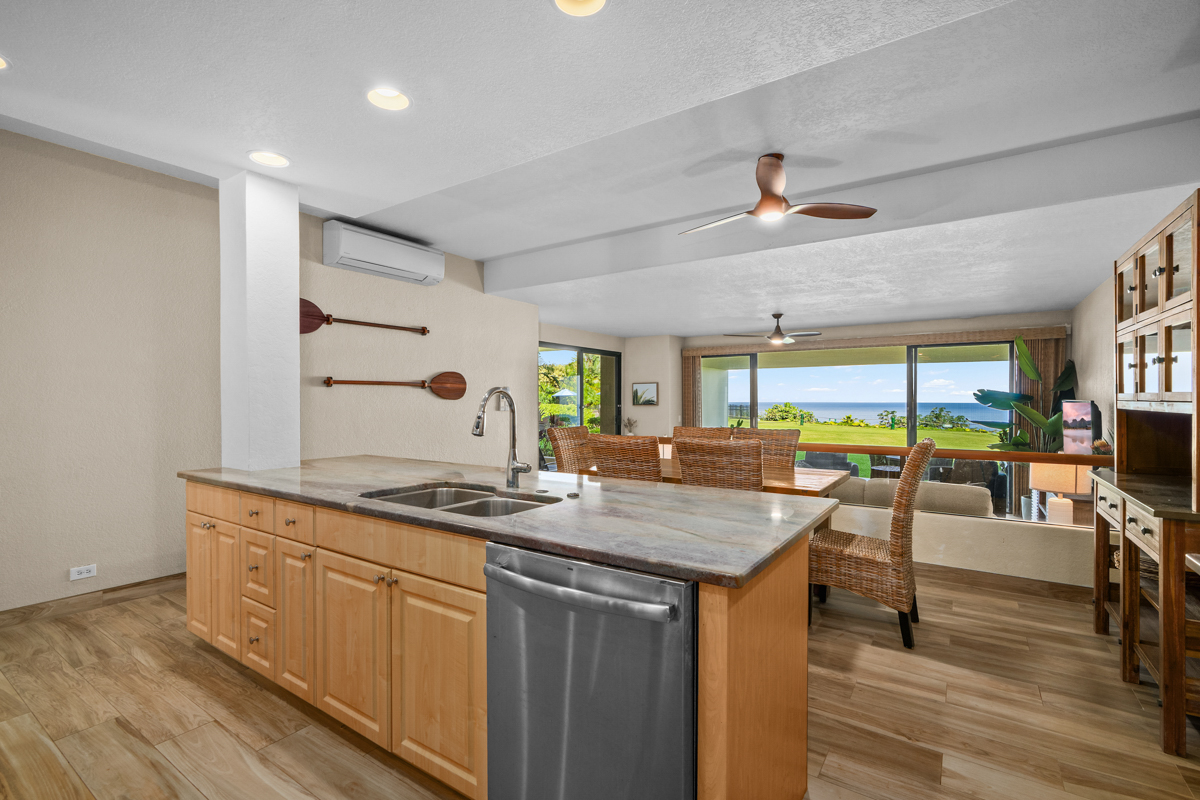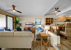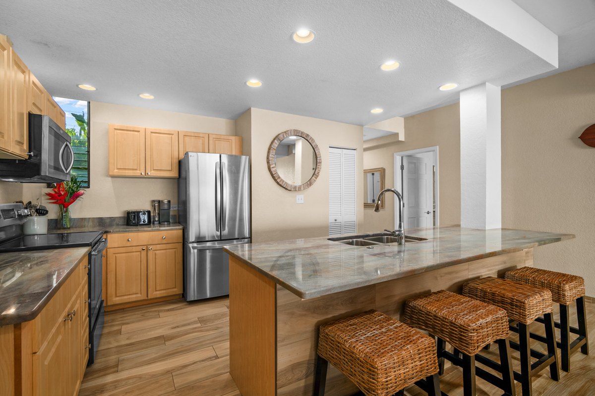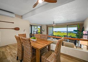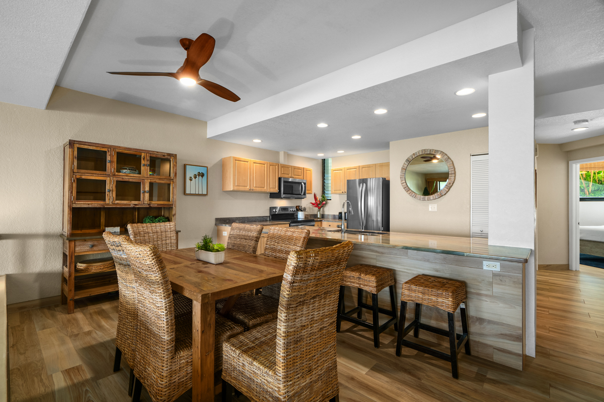 This beautiful first-floor, two-bedroom unit features ocean views and access to a huge manicured lawn atop Hideaways beach. The main living area features modern furniture with an HD smart TV for all your entertainment needs. There is high-speed internet and two separate massive lanais. One boasts outdoor dining and seating and the other has a large BBQ and chaise loungers to relax in.