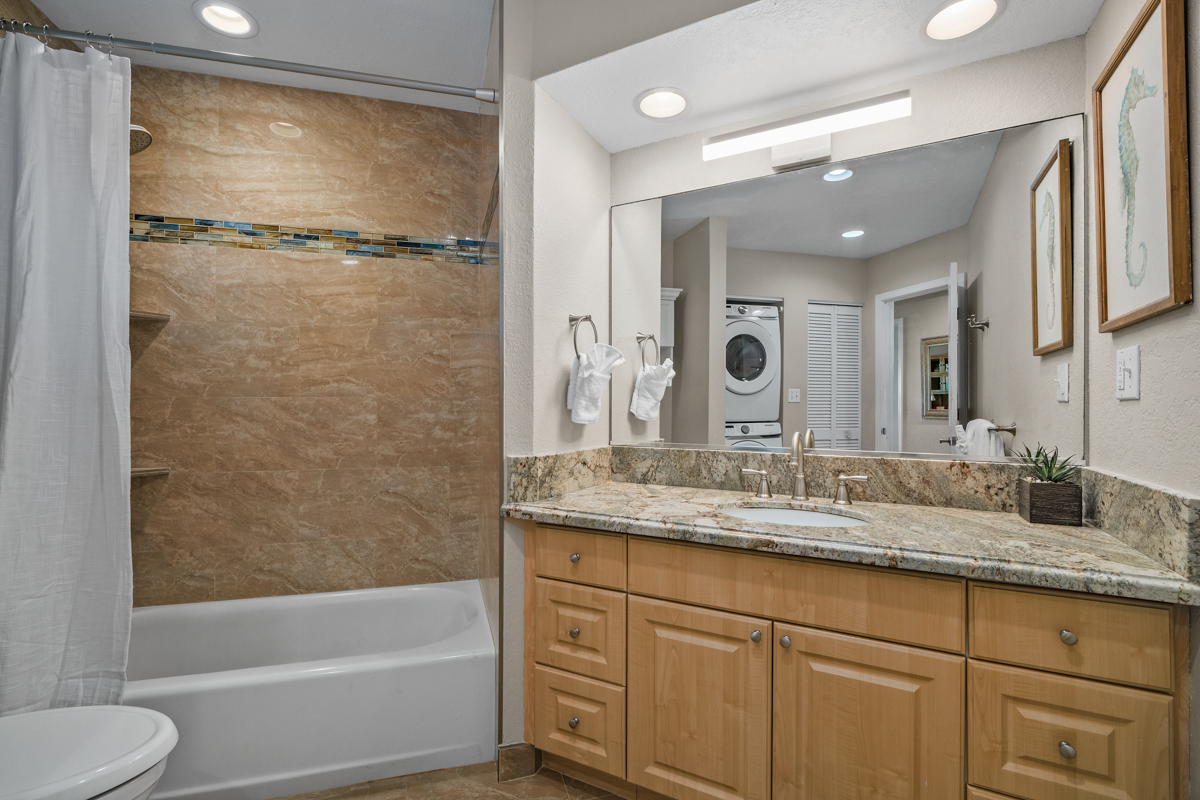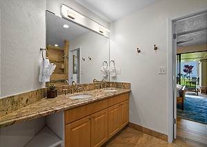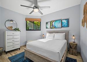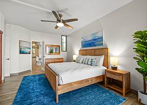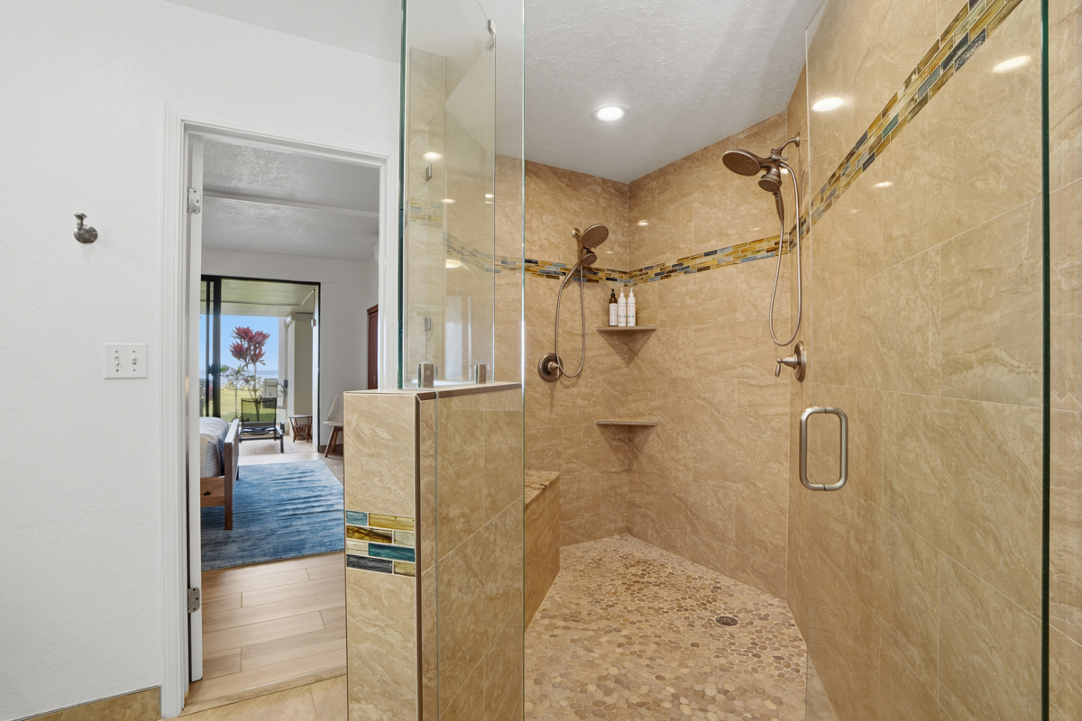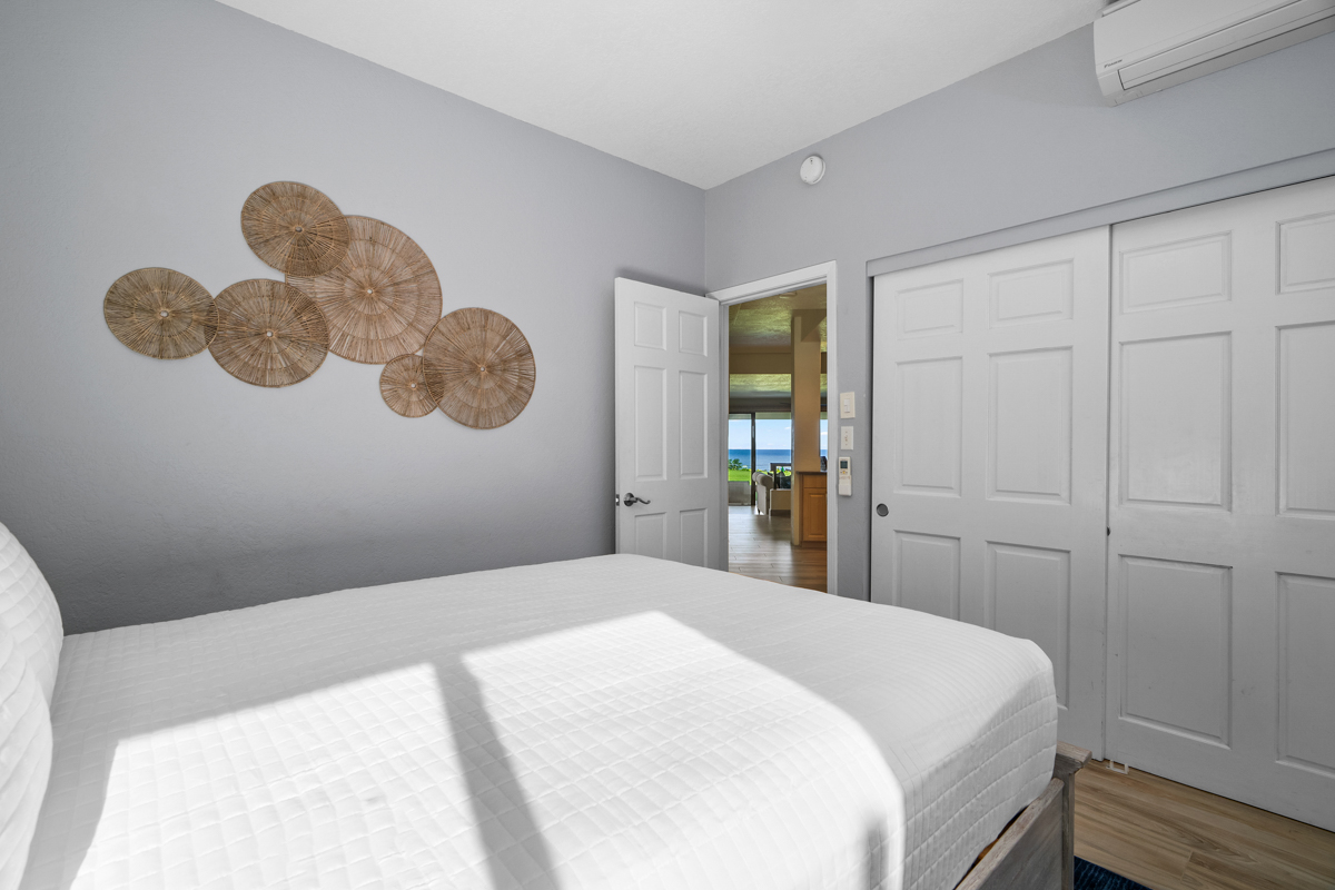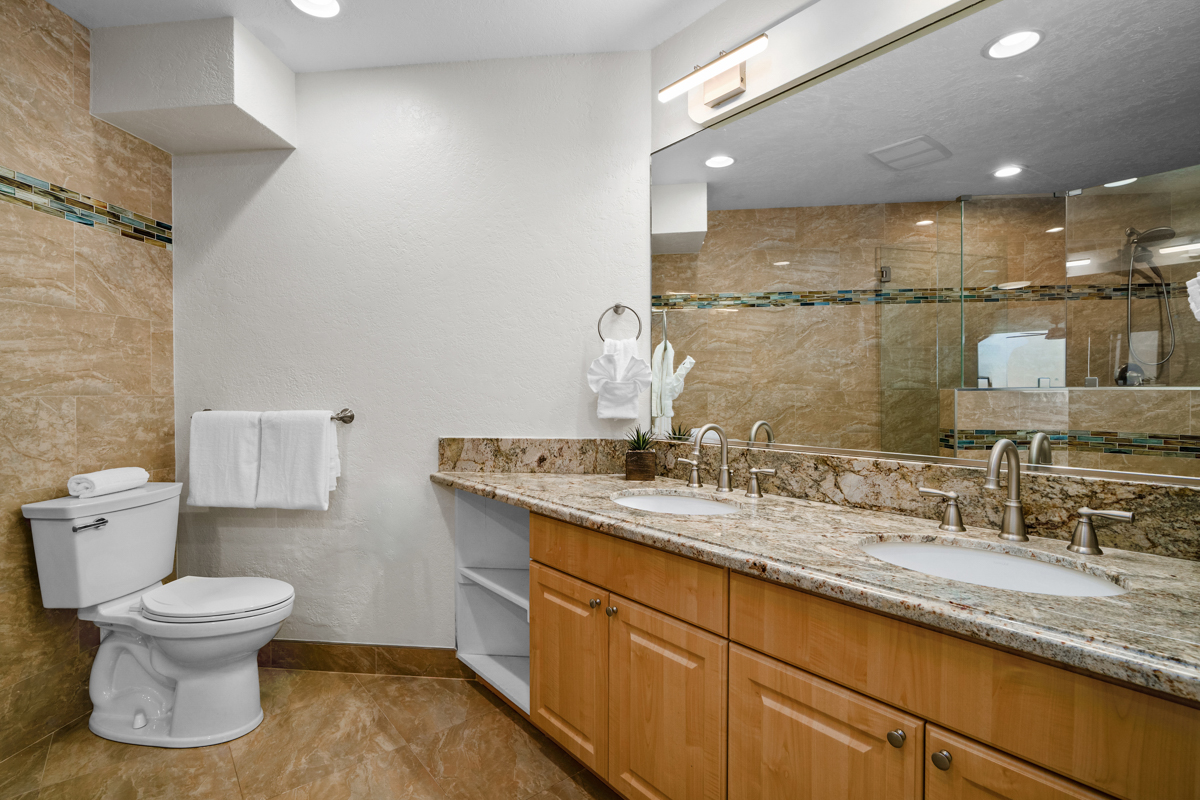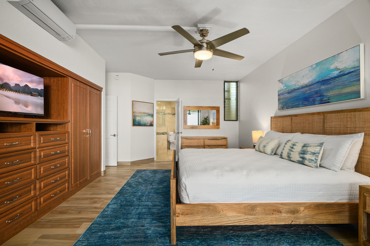 The master suite has sliding glass doors that open let in the cool ocean breeze and features a king-sized bed, cold AC and a beautiful en-suite bathroom. The ensuite bathroom features dual vanities, and an enormous spa style double shower.